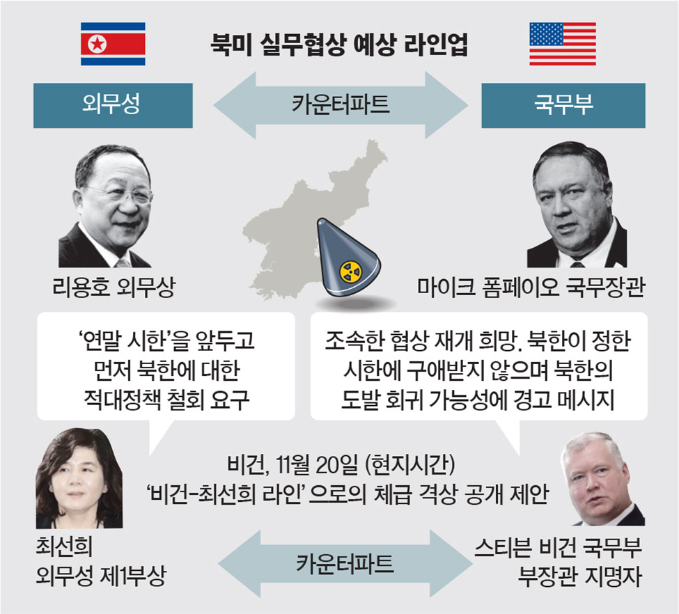 이처럼 평양의 대미라인이 부산해진 건 김정은이 언급한 ‘연말 시한’이 코앞에 닥친 때문으로 볼 수 있다. 김 위원장은 지난 4월 최고인민회의 시정연설에서 “미국이 올바른 자세를 가지고 우리와 공유할 수 있는 방법론을 찾은 조건에서 제3차 조미 수뇌회담을 하자고 한다면 우리로서도 한번은 더 해볼 용의가 있다”면서 “어쨌든 올해 말까지는 인내심을 갖고 미국의 용단을 기다려 볼 것”이라고 밝혔다. 자칫 미국과의 채널 유지나 회담 개최에 대한 전망 없이 해를 넘겼다가는 북미 관계에 파장이 미칠 수 있는 데다 북한 외교라인에 대한 책임 문제가 불거질 공산도 크다. 지난 2월 하노이 북미 정상회담 결렬 이후 김영철 노동당 부위원장 등이 문책당하는 모습을 지켜본 외무성 대미라인의 마음이 다급해질 수밖에 없는 이유다.