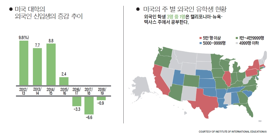 트럼프 정부는 비싼 등록금 탓이라고 주장하지만 무역전쟁과 반(反)무슬림 정책 때문이라는 비판도 많아 매사추세츠주 케임브리지의 하버드대학. 미국의 대학에서 외국인 신입생이 감소한다. / 사진:AP/YONHAP미국 국제교육원(IIE)이 지난 11월 18일 발표한 보고서에 따르면 2018/19년도 미국 대학에 입학한 외국인 학생 수는 전년보다 0.9% 감소했다. 그 수는 2016/17년도 들어 10년 만에 처음으로 3.3%, 2017/18년도엔 6.6%나 하락했다. 3년 연속 감소 추세지만 감소폭은 상당히 줄었다. 아울러 신입생 중 외국인 수는 줄었어도 2018/19년도 미국 대학에 등록한 전체 외국인 학생은 약 110만 명으로 전년 대비 0.05% 늘어났다.