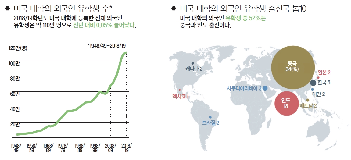 중국 다음으로 미국 대학에 다니는 학생이 많은 나라는 인도, 한국, 사우디아라비아 출신 순이다. 한국 유학생 수는 5만2250명으로 전체 유학생 순위에서 3위를 기록했지만 전년도보다 4.2% 감소했다. 사우디 출신 학생 수도 감소했다. 트럼프 대통령의 심한 반(反) 무슬림 언급도 그 이유 중 하나로 꼽힌다(AP 통신은 사우디 정부의 자국 유학생에 대한 장학금 프로그램 축소를 유학생 수 감소 원인으로 꼽았다). 트럼프 대통령은 2016년 대선 선거운동에서 무슬림의 미국 입국을 완전히 금지할 것을 촉구했다. 그와 대조적으로 미국 대학에 이전보다 더 많은 학생을 보내는 나라도 있다. 브라질과 방글라데시 출신 유학생 수가 지난해 10% 증가했다. 카사그랜디 차관보는 트럼프 대통령과 자이르 보우소나루 브라질 대통령 사이의 강한 개인적 유대 때문에 더 많은 브라질 학생이 미국에서 공부하게 될 것이라고 주장했다.