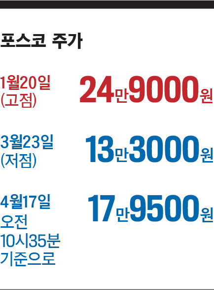 포스코 주가는 올해 1월 20일 24만9000원까지 올랐다가 코로나19 사태 여파로 연일 하락해, 3월 23일에는 13만3000원으로 주저앉았다. 그러나 포스코가 1조원 규모의 자사주를 취득한다고 발표한 이후 회복세로 돌아섰고, 4월 17일 오전 10시 35분 기준으로 17만9500원을 기록 중이다.