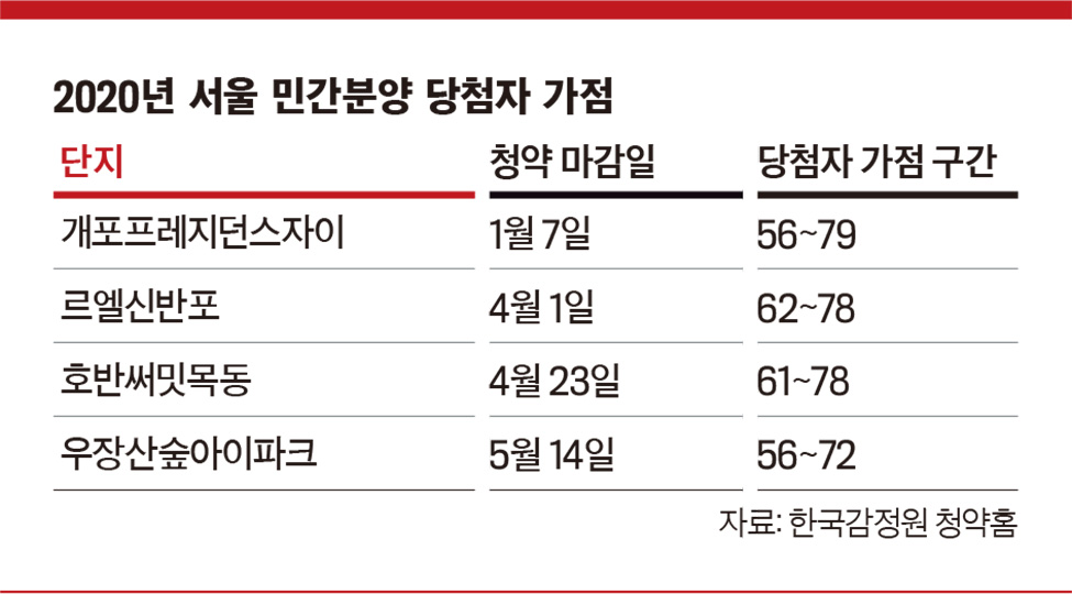 실제 올 들어 당첨자 발표일 기준으로 이달까지 서울에 공급된 민간분양 아파트 3곳의 가점 커트라인은 ‘르엘신반포’ 62점, ‘호반써밋목동’ 61점, ‘우장산숲아이파크’ 56점 등이다. 올해 기준 만 39살에 두 자녀를 가진 직장인을 가정했을 때 받을 수 있는 가점은 무주택기간 18점(8~9년), 부양가족 20점(배우자 및 두 자녀), 청약통장 가입기간 17점(15년 이상) 등 55점으로 커트라인이 가장 낮았던 ‘우장산숲아이파크’ 최저 가점에도 미치지 못한다.