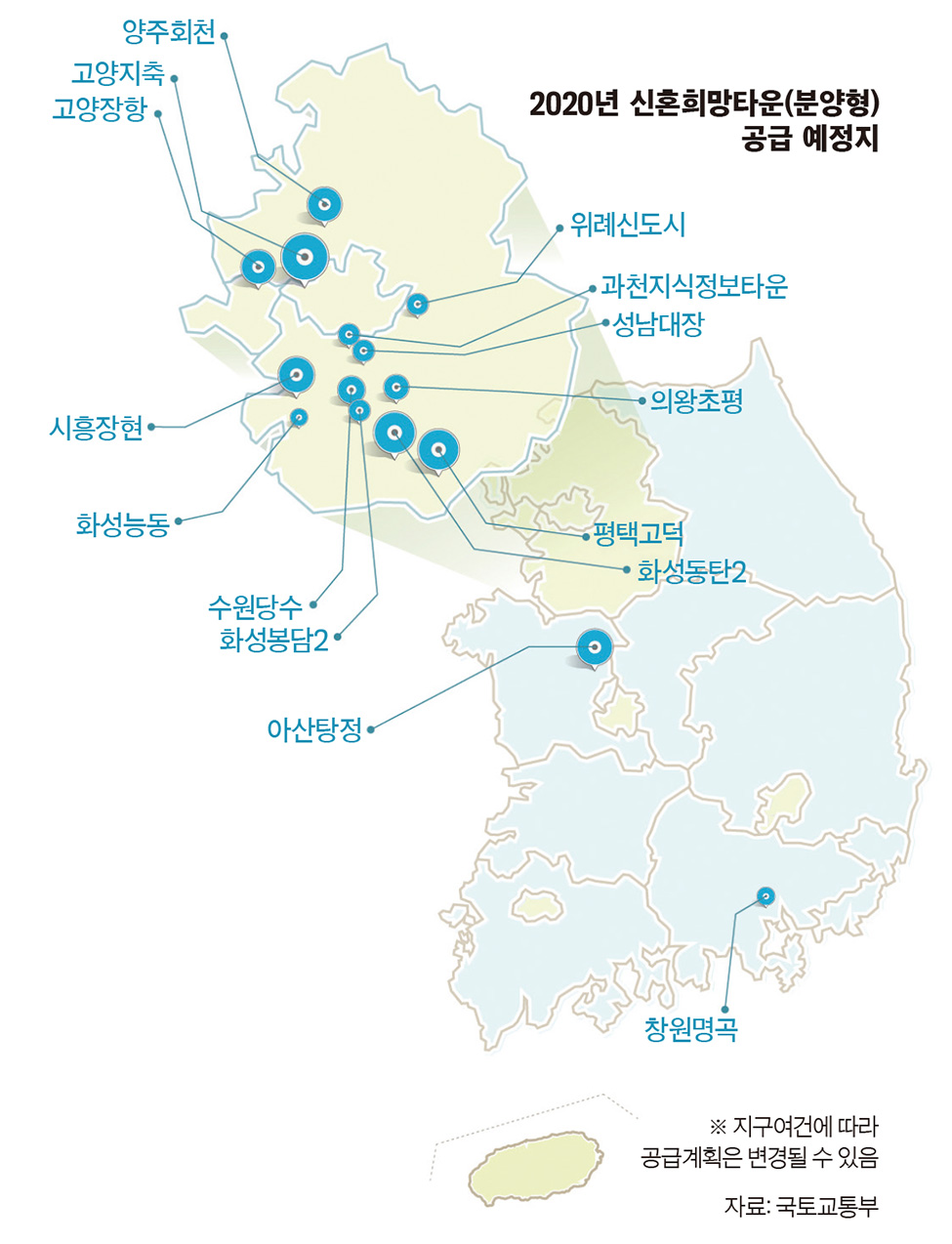 정부는 신혼특공과 함께 ‘신혼희망타운’이라는 이름의 공공주택도 공급하고 있다. 국공립어린이집 설치, 놀이공간 확보 등 육아특화설계를 적용해 공급 주택 전부를 신혼부부에게 공급하는 구조로 주변 단지 시세의 70~80% 금액으로 분양한다. 정부는 이를 2022년까지 10만호 공급한다는 계획인데, 이 역시 젊은 신혼부부에게 큰 희망이 되진 못하는 모양새다.