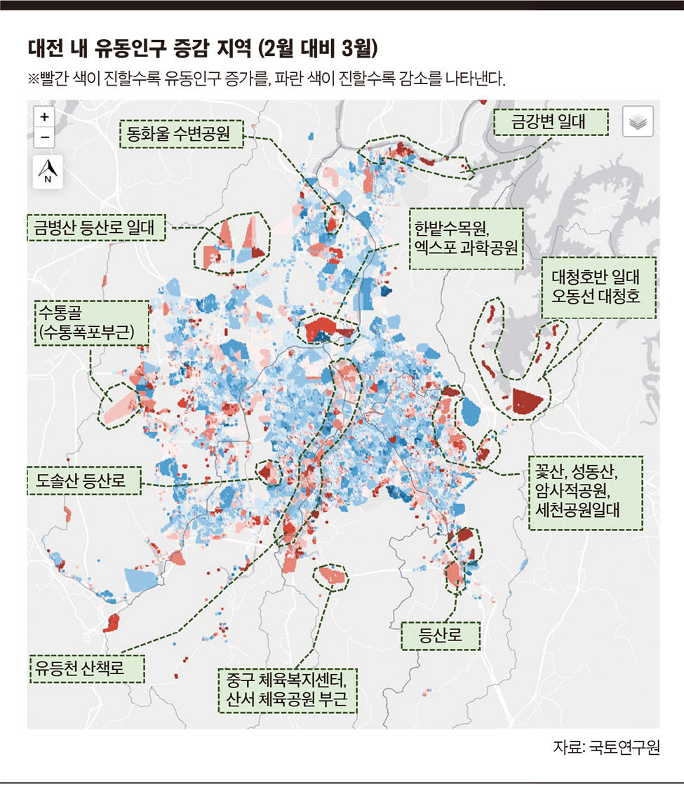 올해 2월 주말 유동인구의 대부분은 유림공원, 갑천변, 남간정사, 보문산, 화폐박물관 등 주로 도심 자연공원에 몰렸다. 한 달 후 3월 유동인구는 금강변, 대청호, 우암사적·세천공원, 만인산, 산서체육공원, 도솔산, 구봉산, 장태산, 계룡산 수통골, 금병산, 동화울 수변공원 등에서 급증했다. 이 지역들은 자연환경이 우거진 도시 외곽이다. 3월엔 대전에 코로나19 확진자가 증가하던 때였다.