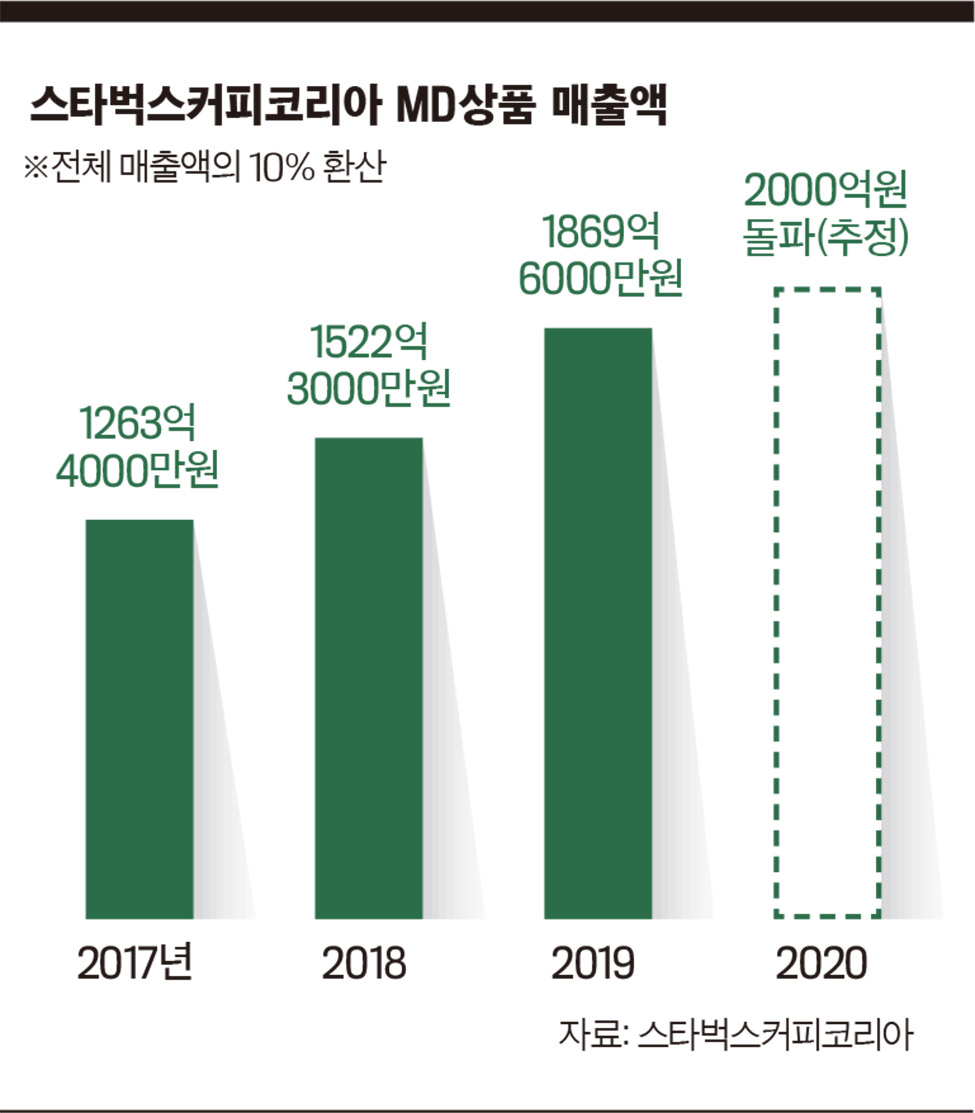 스타벅스커피코리아에 따르면 MD상품 매출은 전체 매출액의 10%가량을 차지하는 것으로 나타났다. 전체 매출액으로 추정치를 계산해본 결과, MD상품 매출액은 2017년 1263억4000만원, 2018년 1522억3000만원, 2019년 1869억6000만원에 해당한다. 최근 3년간 평균적으로 300억원 가량 매출액이 늘어난 것으로 보면 올해 MD상품 매출액은 처음으로 2000억원 규모를 기록할 것으로 예측된다.