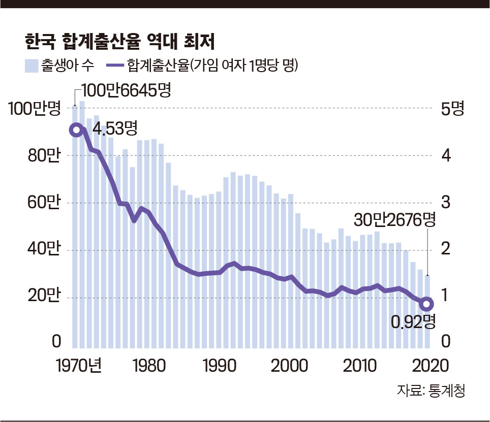 인구 자연감소 시작… 도심화 현상은 더욱 가속화 될 듯 출산율의 지속 하락으로 올 상반기 합계출산율은 0.918을 기록했다. 산부인과 신생아실.이제 우리나라도 본격적으로 인구 감소국 대열에 합류했다. 올 상반기 사망자 수가 출생아 수를 앞지르면서 우리나라도 이제 일본 등의 뒤를 이어 인구 자연감소 국가가 될 전망이다. 문제는 정부와 사회가 숱한 노력을 하고 있지만 이 추세는 되돌리기 어렵다는 점이다. 우리나라 출산율은 초저출산율(1.3명 이하)을 넘어 초초저출산율(0.918명)을 기록해 인구통계를 집계하는 국가 중 가장 낮다.