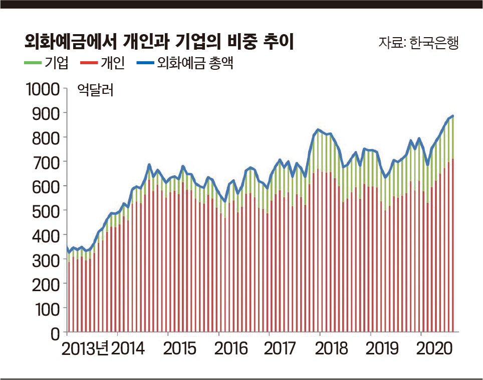 한국은행이 매월 공표하는 거주자 외화예금 통계를 보면 두 가지 특징이 발견되는데, 하나는 개인 외화예금의 비중이 늘어나는 것이고 다른 하나는 달러화의 비중이 늘어나는 것이다. 2020년 8월 외화예금 중 기업의 비중이 80%에 달해 20%에 불과한 개인의 4배에 해당하지만, 늘어나는 속도를 보면 기업의 외화예금 증가에 비해 개인의 외화예금 증가 속도가 훨씬 빠르다. 2012년 6월 외화예금에서 개인의 비중은 기업의 11%에 불과했으나 2020년 8월에는 기업의 25%까지 상승했다.