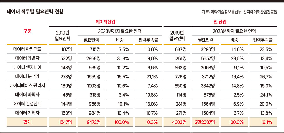 실제 한국데이터산업진흥원의 국내 데이터산업 현황조사를 보면 2019년 기준 순수 데이터 직무인력(지원인력 제외)은 8만9000명 수준이다. 2020년 기준 산업계에 부족한 인원은 약 4000여 명에 달하는 것으로 추산된다. 인공지능·클라우드 분야까지 포함하면 인력 가뭄 문제는 더 커질 수 있다. 소프트웨어정책연구소는 향후 3년간 인공지능에 2만5000명, 클라우드에 7800명이 부족할 것으로 전망했다.