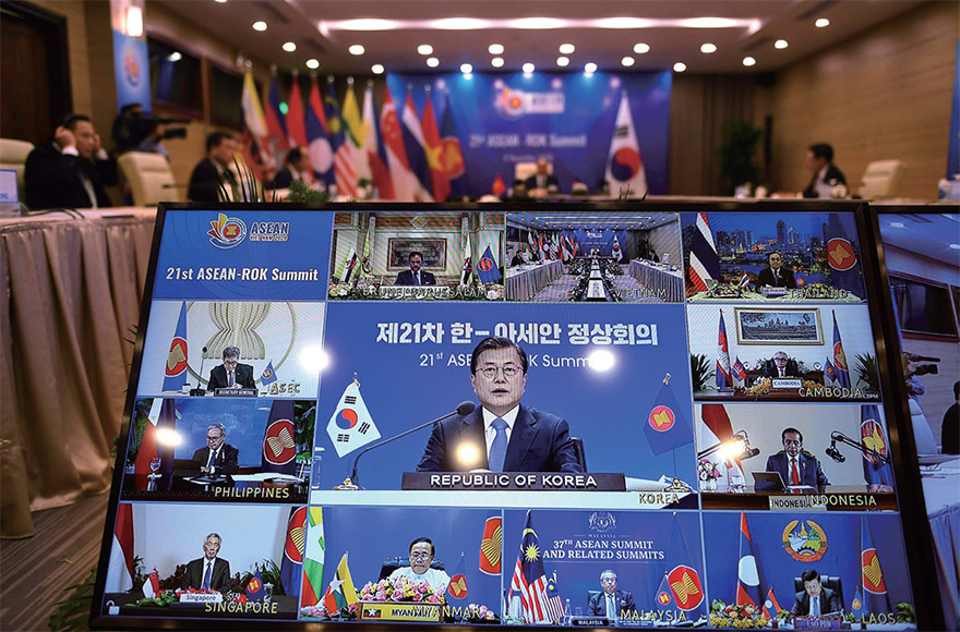 선진국 경제 회복, 미·중 통상마찰에 좌우… 관광업이 2021년 반등 성장의 변수 될 듯 문재인 대통령이 2020년 11월 12일 코로나19 사태 속 온라인 화상으로 열린 한-아세안 정상 회의에서 연설하고 있다. / 사진:AFP=연합뉴스2019년까지 높은 성장률을 구가해오던 동남아시아국가연합(ASEAN·아세안) 역시 신종 코로나바이러스감염증(코로나19) 대유행을 피해가지 못하고 있다. 아세안 주요국(말레이시아·베트남·싱가포르·인도네시아·태국·필리핀)의 경제 성장률은 2020년 1분기 후 급격히 낮아졌고 2분기에는 베트남을 제외한 모든 국가가 큰 폭의 마이너스 성장을 했다. 특히 말레이시아·필리핀·싱가포르·태국은 -12%에서 -17%까지 추락했다.