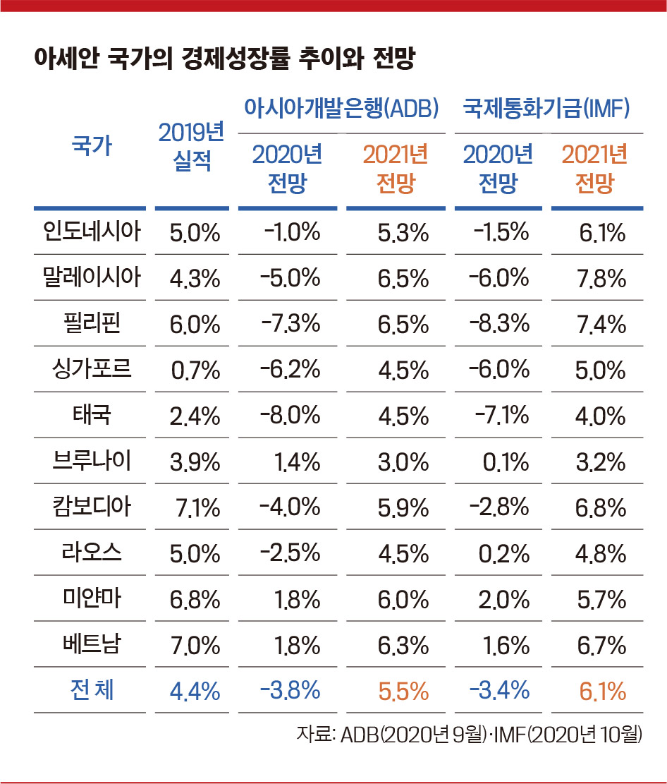 2021년 아세안 경제는 5% 중반 성장할 것으로 전망된다. 국제통화기금(IMF)은 이보다 높은 6%대를 전망한다. 이는 아세안이 높은 성장세를 구가하던 2010년대 초반과 같은 성장 속도다. 말레이시아·베트남·인도네시아·필리핀 등이 높은 성장률을 기록할 전망이다. 캄보디아와 미얀마 역시 6% 가까이 성장할 것으로 예상한다.
