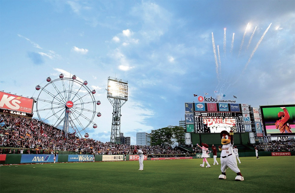 일본 야구단 도호쿠 라쿠텐 골든이글스 홈구장 외야 전광판 뒤편으로 대규모 놀이동산 ‘스마일 글리코 파크’의 대관람차가 보인다. / 사진:rakuten.today일본의 최대 온라인상거래(e커머스) 업체 라쿠텐은 동일본 대지진 피해가 극심했던 일본 도호쿠 지방을 근거지로 하는 프로야구팀 ‘라쿠텐 골든이글스’를 2004년 창단했다. 창단 초기 일본 프로야구계가 50년 만에 새 구단의 프로야구 진입을 허용한 팀으로 이슈가 된 이후 신개념 야구장으로 더욱 주목 받고 있다.