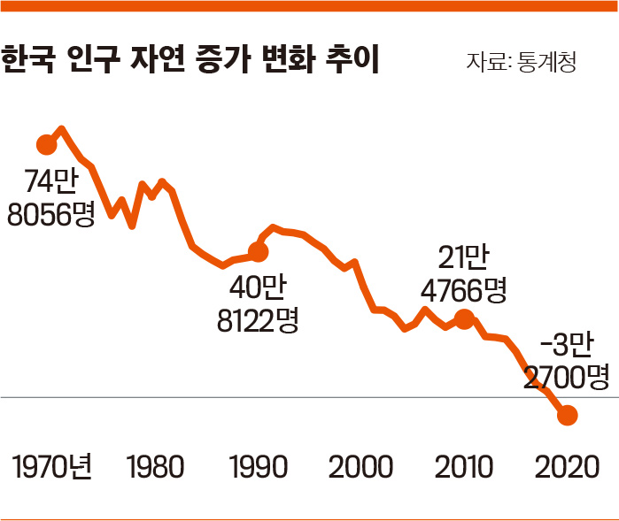 출산율마저 0.84명 세계 최저… ‘인구 감소’ 경제 위기 본격화 우려 지난해 한국의 합계출산율이 0.84명으로 줄며 사상 처음으로 인구가 자연 감소했다. 통계청이 2월 24일 발표한 ‘2020년 출생·사망통계 잠정 결과’에 따르면 지난해 출생아는 27만2400명으로 1년 전보다 3만300명(10%) 감소했다. 반대로 사망자는 30만5100명으로 전년 대비 1만 명(3.4%) 증가, 2020년 한 해 동안 한국 인구는 3만2700명 자연 감소한 것으로 집계됐다.