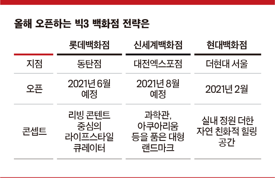 이는 비단 현대백화점만의 이야기가 아니다. 국내 빅3 백화점인 롯데백화점, 신세계백화점 모두 추락하는 백화점을 살리기 위한 변신을 꾀하고 있다. 오는 8월 대전에 들어설 신세계백화점도 비슷한 흐름에 있다. 백화점이라기 보다 복합문화 상업단지를 지향한다. 카이스트와 협업해 신세계 과학관, 사이언스센터 등이 들어선다. 자체 브랜드인 ‘오노마 호텔’도 선보인다. 쇼핑부터 문화·체험교육·숙박을 원스톱에서 해결하겠다는 신세계백화점의 전략이다.