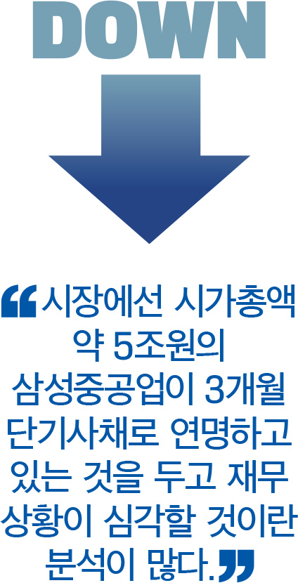 예탁결제원 등에 따르면 삼성중공업은 최근 1년간 3개월 만기의 일반단기사채를 지속적으로 발행해 자금을 수혈하고 있다. 삼성중공업은 지난해 4월 300억원의 단기사채를 발행한 것으로 시작으로 6월 700억원, 7월 300억원, 9월 500억원, 10월 700억원, 12월 500억원, 올해 1월 500억원, 4월 300억원 등 총 3800억원의 자금을 조달했다. 시가총액이 약 5조원에 달하는 회사가 3개월 만기의 단기사채를 통해 빚을 빚으로 갚는 상황을 되풀이하고 있는 셈이다.