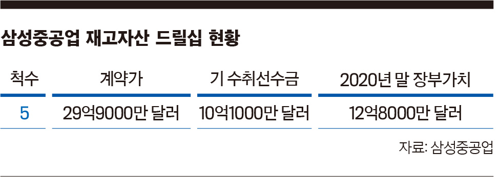설상가상으로 시간이 지나면서 이들 드릴십의 재고자산 가치도 하락 중이다. 2019년 말 드릴십 5척의 장부가치는 15억9000만 달러였는데, 지난해 말 12억8000만 달러로 약 20% 하락했다. 약 3465억원이 줄어든 셈이다. 증권업계에서 “드릴십 5척에 대한 매각이 이뤄지지 않는 한 삼성중공업의 흑자 전환이 쉽지 않을 것”이란 전망이 나오는 이유다.