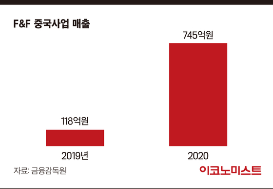 F&F의 중국 사업 확장에는 지난해 높은 성장세를 기록한 중국 사업 매출액이 뒷받침했다. 금융감독원 자료에 따르면 F&F 중국 매출은 2019년 118억원에서 2020년 745억원으로 1년 사이에 매출액이 6배 가량 껑충 뛰었다. F&F 전체 매출에서 해외 매출이 차지하는 비중은 2019년 4%에 불과했다. 그러나 지난해에는 중국시장에서 발생한 매출이 전체의 12%를 차지할 정도로 급성장했다.