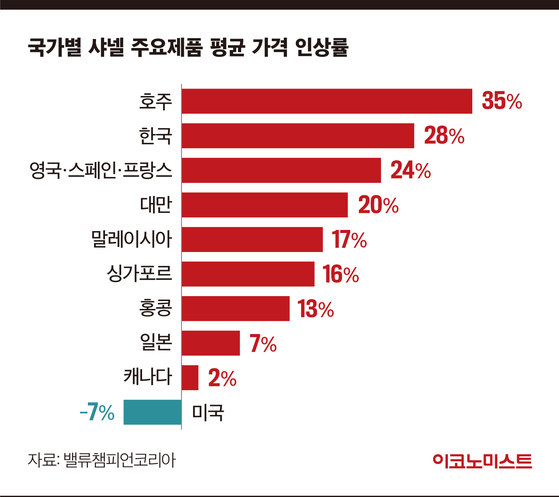 금융정보분석업체 밸류챔피언이 지난해 15개 국가의 샤넬 주요 상품 가격변화를 비교해보니 평균 가격 인상률이 17%로 나타났다. 15개 나라 중 호주가 35%로 가장 크게 상승했고, 한국은 28%를 기록해 두 번째로 높은 나라였다. 중국, 영국, 스페인, 프랑스, 대만 등도 가격이 올랐지만 20%에 머물렀다. 캐나다의 경우에는 가격 인상 폭이 2%에 그쳤고, 미국 내 샤넬 가격은 오히려 7% 내렸다.