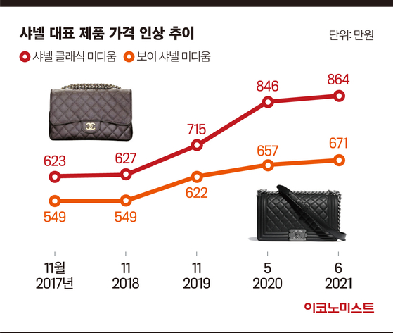 2018년에는 무려 4차례 가격을 인상했다. 1월엔 향수, 스킨케어, 메이크업 제품 등 326개 품목 가격을 평균 2.4% 인상했고 같은 해 5월에는 가방과 신발 등 주요 제품 가격을 11% 이상 올렸다. 7월엔 뉴미니 등 가방제품 일부를 인상했고 11월엔 클래식과 보이, 빈티지 라인 가방 등 가격을 올렸다.