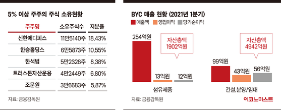 마찬가지로 신한에디피스는 한 상무가 10대 때부터 최대주주로 설립된 곳. 공교롭게도 설립 자금은 증여재산 공제를 받을 수 있는 최대 금액인 5000만원이다. 이른 나이부터 승계를 위한 기초 작업을 해오면서 BYC 주식을 조금씩 매입해 나갔다.