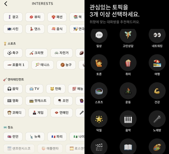 클럽하우스와 달리 음은 초대장 없이 이용할 수 있다. 카카오 계정만 있다면 가입이 가능하다. 카카오 계정으로 로그인한 후부터 닉네임 입력, 관심 토픽 설정까지 2분도 채 걸리지 않았다. 가입이 쉽다는 것도 음의 장점이다.