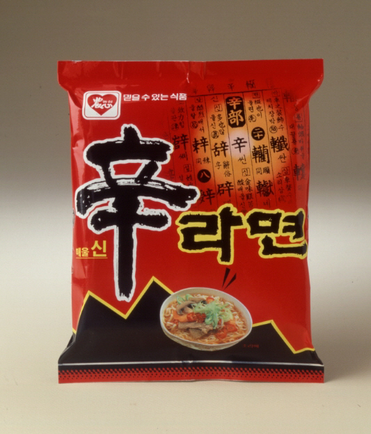 큼직하게 한자 매울 ‘辛(신)’자가 적힌 제품 표지는 현재 신라면의 대표 이미지가 됐지만, 출시 당시에는 이례적인 디자인으로 상표등록 과정부터 어려움을 겪었다. 1980년대 당시 식품위생법은 ‘식품 상품명 표시는 한글로 해야 하고 외국어를 병기하고자 할 때는 한글 표시보다 크게 할 수 없다’는 규정이 있었기 때문이다.