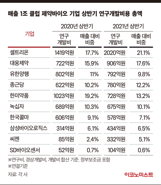 제약‧바이오 R&D 비용…셀트리온·대웅제약 ↑, 한미약품·한국콜마 ↓