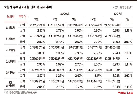 지난해 2%대 주담대 금리를 선보였던 삼성생명과 한화생명, 교보생명 등은 지난달 금리가 3%대 초반까지 상승했다. 지난해 9월 2.9%대로 금리를 내렸던 현대해상의 올 7월 금리도 3.62%까지 올랐다.