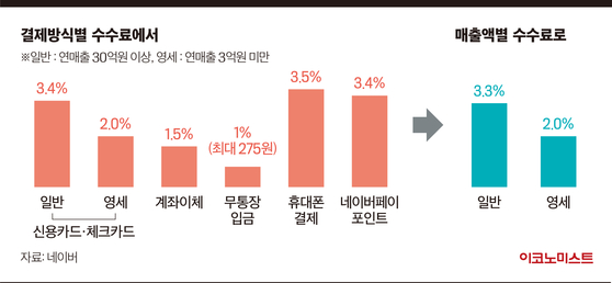 지난해 한 차례 논란이 일자 네이버파이낸셜은 지난 7월 주문관리수수료 체계를 개편했다. 신용카드·체크카드나 네이버페이 포인트 등 결제수단별로 달랐던 수수료율을 매출액 기준으로 단일화했다. 매출액 3억원 미만 영세업자는 결제수단과 상관없이 2% 수수료만 내면 되는 식이다. 가령 신용카드로 물건을 샀을 때 수수료는 3.4%에서 2%로 내려간다. 이밖에 매출액 30억원 미만 사업자도 2.5~2.8% 수수료만 부담하면 된다.