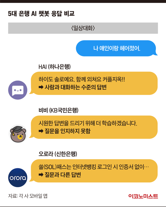 하지만 아직 대다수 은행 챗봇의 AI 수준은 걸음마 단계다. 일상대화를 원활히 진행하기 어려웠다. 대부분 질문에 대해 “아직 준비된 답변이 없어요”, “질문을 인식할 수 없습니다” 등 답변이 이어졌다. 신한은행 오로라는 ‘나 애인이랑 헤어졌어’라는 말에 신한은행 쏠(SOL) 앱 전용 로그인 방식인 ‘쏠패스’를 안내하는 등 엉뚱한 답변을 하기도 했다.