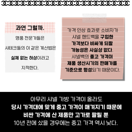 과연 그럴까요. 명품 전문가들은 샤테크족들의 이 같은 계산법은 실체 없는 허상에 가깝다고 지적합니다. 가격 인상 효과로 소비자가 샤넬 핸드백을 산 가격보다 비싸게 되팔 가능성은 사실상 없다는 것이죠. 샤넬백의 중고 가격이 제품 생산 시기의 판매가를 기준으로 형성되기 때문입니다.