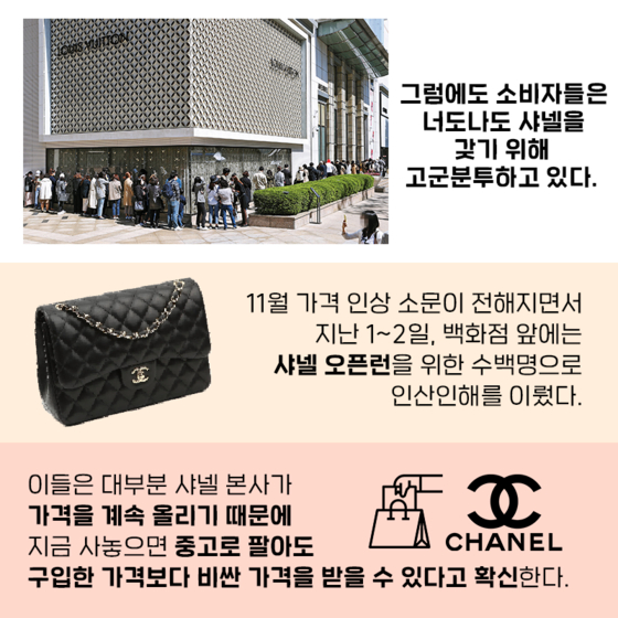 한국은 샤넬의 가격 인상 폭이 가장 높은 나라 측에 속합니다. 그런데도 소비자들은 너도나도 샤넬을 갖기 위해 고군분투하고 있죠. 이번에도 11월 가격 인상 소문이 전해지면서 지난 1~2일, 백화점 앞에는 샤넬 오픈런을 위한 수백 명으로 인산인해를 이뤘는데요. 이들은 대부분 샤넬은 중고로 팔아도 산 가격보다 비싼 가격을 받을 수 있다고 확신합니다. 이른바 샤테크인데요.