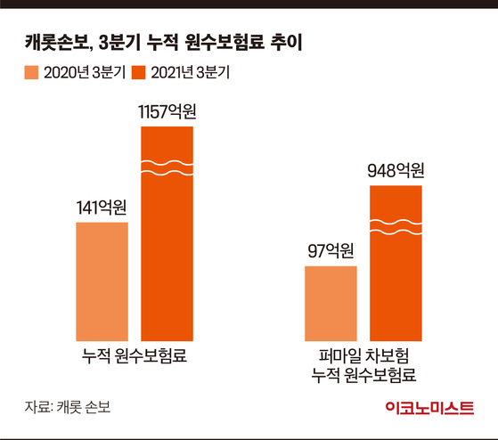다만 주력 상품인 퍼마일자동차보험의 실적이 순항 중이다. 캐롯손보의 올 3분기 누적 원수보험료는 1157억원으로 지난해 동기(141억원) 대비 8배가량 증가했다. 원수보험료 증가세는 주력 상품인 퍼마일자동차보험이 이끌었다. 퍼마일자동차보험의 올 3분기 누적 원수보험료는 948억원으로 지난해 동기(97억원) 대비 약 980% 늘었다.