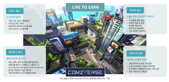 컴투버스 플랫폼에는 장소에 구애받지 않는 가상 오피스 환경을 제공하는 ‘오피스 월드’, 언제든 필요한 제품을 구매하고 의료 및 금융 서비스 등을 이용할 수 있는 ‘커머셜 월드’가 조성된다. 게임, 음악, 영화, 공연 등 각종 엔터테인먼트를 즐길 수 있는 ‘테마파크 월드’, 이용자들이 함께 소통할 수 있는 ‘커뮤니티 월드’도 포함된다.