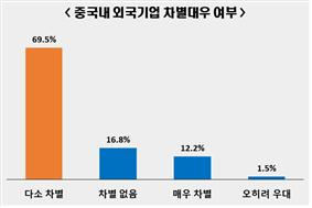 중국에 진출한 한국기업 10곳 중 8곳 이상은 외국기업에 대한 차별이 있다고 답했다. 그중 12.2%는 ‘매우 차별’ 한다고 인식하는 것으로 나타났다. 구체적으로는 ‘인허가 절차(49.6%)’에 대한 차별을 가장 많이 언급됐다. 이어 ‘소방·안전점검 등 각종 영업규제(21.5%)’, ‘환경규제(14.0%)’, ‘세제·금융지원차별(12.1%)’ 등의 순으로 나타났다.