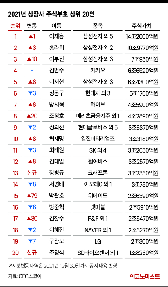 이로써 2020년 故 이건희 회장, 이재용 삼성전자 부회장, 정몽구 현대차 명예회장, 김범수 카카오 의장, 홍라희 전 리움미술관 관장 순이었던 주식부호 상위 5인이 2021년에는 이 부회장, 홍 전 관장, 이부진 사장, 김 의장, 이서현 이사장 순으로 재편됐다.