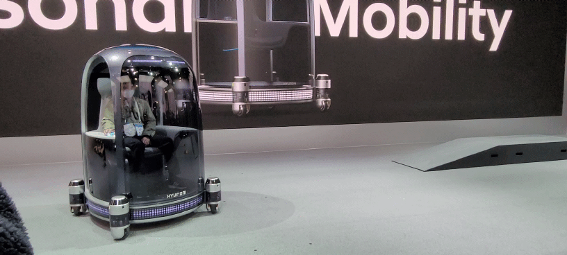 현대차 부스에서 볼 수 있는 로봇개 스팟의 댄스 시연 모습. [김영은 기자] 스팟의 시연이 끝난 후에는 "모든 사물이 모빌리티가 될 수 있다(MoT)"는 현대차 모빌리티 전략을 실현하기 위한 로봇이 대거 등장했다. 어느 사물에든 붙일 수 있는 ‘바퀴’가 바로 현대차가 선보인 로봇이다. 소화기 크기의 PnD(Plug and Drive Module) 모듈은 인휠(in-wheel) 모터와 스티어링, 서스펜션, 브레이크 시스템 및 환경인지 센서를 하나로 결합한 일체형 모빌리티다. 라이다와 카메라 센서를 바탕으로 지능형 스티어링, 주행, 제동이 가능하다. PnD 모듈을 부착한 단순한 형태의 1인용 모빌리티도 등장했다. 1인용 모빌리티는 연속적인 360° 회전은 물론 자유로운 움직임을 선보였다. PnD 모듈을 부착한 물류 운송 모빌리티와 라스트마일 모빌리티 역시 전시됐다.