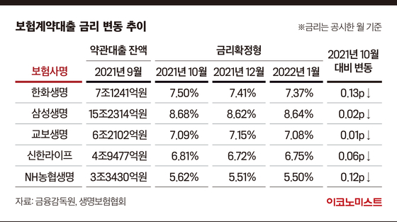 지난해 9월 기준, 약관대출 잔액이 2조원 이상인 생보사인 삼성생명(15조2314억원)과 한화생명(7조1241억원), 교보생명(6조2102억원), 신한라이프(4조9477억원), NH농협생명(3조3430억원)은 모두 지난해 10월 대비, 올 1월 약관대출 금리(금리확정형)가 감소했다.