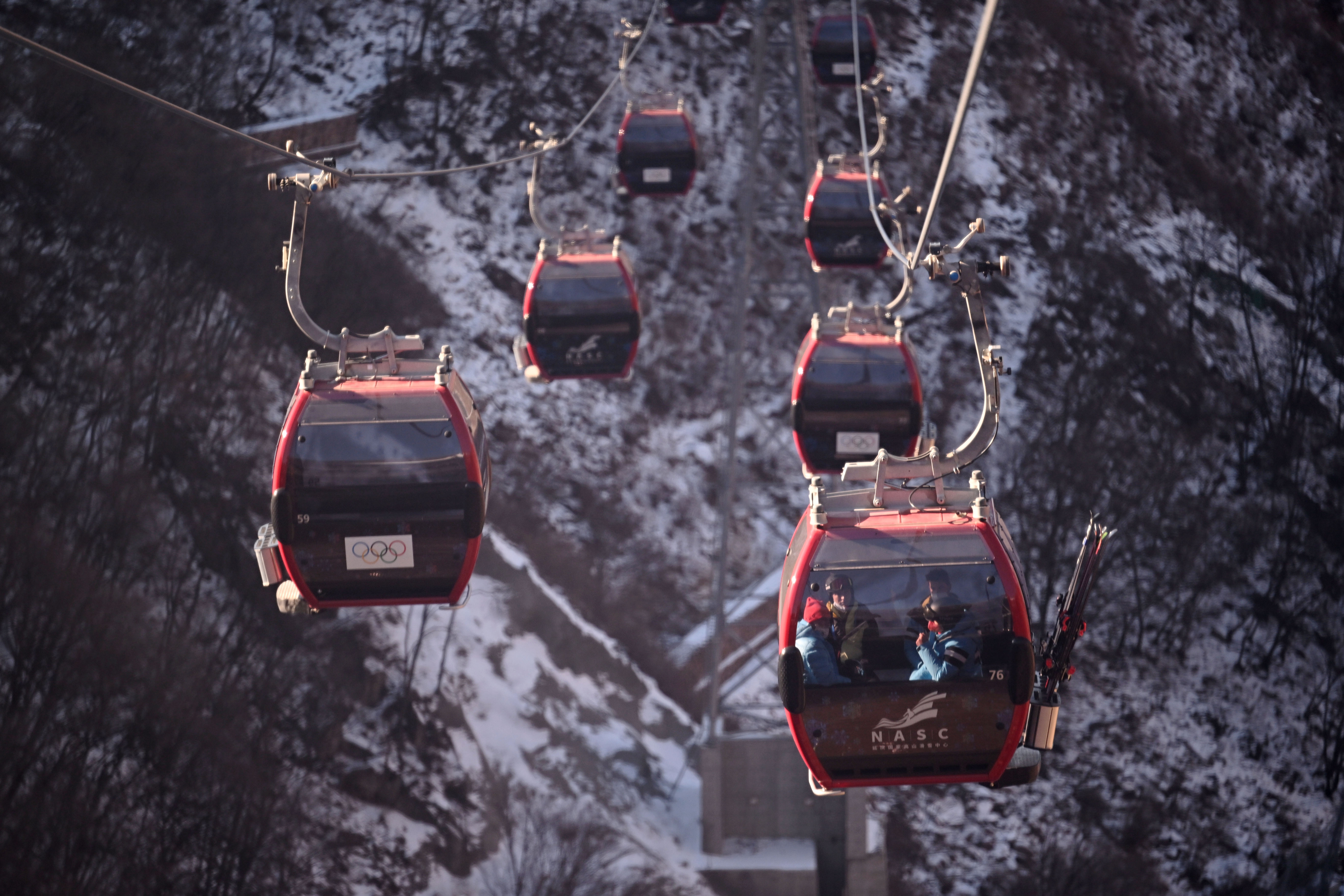 (베이징=신화통신) 천빈 기자 = '2022 베이징 동계올림픽' 옌칭(延慶) 경기구역의 국가알파인스키센터는 최근 동계올림픽을 앞두고 만반의 준비를 하고 있다. 이곳은 총 길이 9.2㎞의 코스 7개로 이뤄져 있으며 올림픽 기간 동안 11명의 금메달 수상자가 이곳에서 탄생할 예정이다. 28일 케이블카를 타고 작업 구역으로 향하는 직원들. 2022.1.28