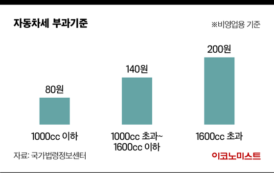 현행 자동차세에 따르면 엔진 배기량이 클수록 세금을 많이 물게 된다. 지방세법 127조에 따르면, 자동차세는 배기량에 세액을 곱해 산정하고 있다. 이때 비영업용의 경우 배기량 1000㏄ 이하는 ㏄당 80원, 1000㏄ 초과 1600㏄ 이하는 ㏄당 140원, 1600㏄ 초과는 ㏄당 200원을 납부하게 된다.