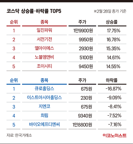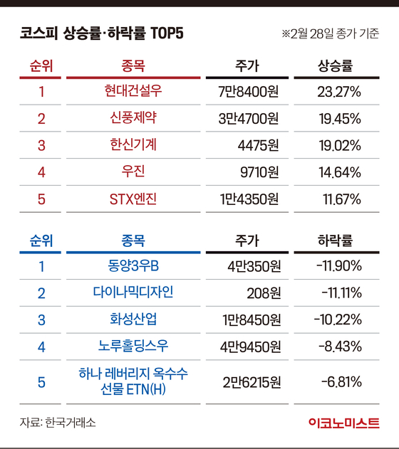 코스피 상승률 1위 현대건설우, 코스닥 1위 일진파워