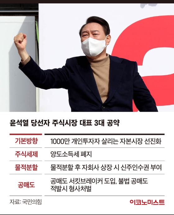 제20대 대통령으로 선출된 국민의힘 윤석열 당선인은 “1000만 개인투자자를 살리는 주식시장을 만들겠다”고 공약했다. 소액주주의 권익을 보호하고 증시 활성화에 힘쓰겠다는 취지다. 주식 양도소득세 폐지와 공매도 서킷브레이커 도입, 물적분할 자회사의 상장 시 모회사 주주에 신주인수권 부여 등이 추진될 전망이다.