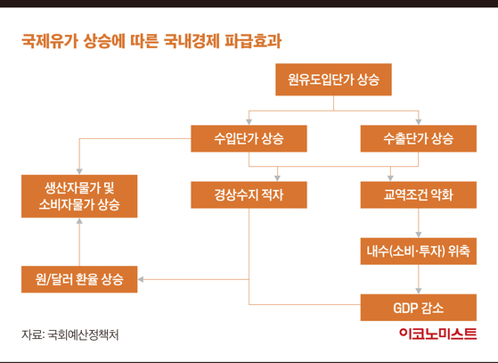 먼저 국제유가 상승은 수입단가 상승을 통해 국내 생산자물가와 소비자물가를 상승시키는 효과를 일으킨다. 국제원자재가격 역시 상승해 교역조건이 악화되고 경상수지는 적자로 돌아설 전망이다. 이 같은 물가상승과 교역조건 악화는 기업의 생산비용 상승과 가계의 실질구매력 약화를 초래해 소비와 투자 등 내수를 위축시키고 GDP를 감소시키리라는 것이 국회예산처의 전망이다. 경제모형을 통해 분석한 결과, 국제유가의 10% 상승은 대략 GDP 0.2%포인트 하락, 경상수지 20억 달러 축소, 소비자물가 0.1%포인트 상승시키는 요인으로 작용할 것으로 나타났다.