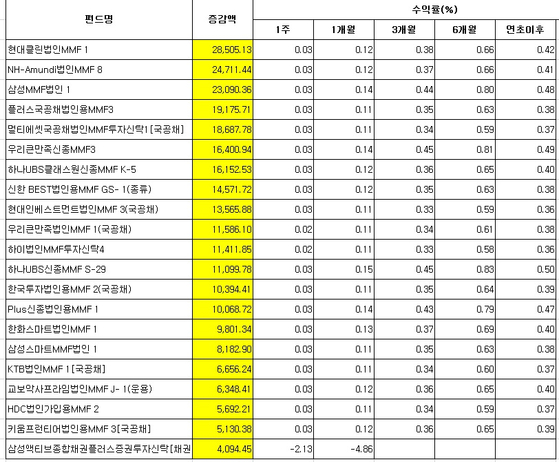 펀드평가사 에프앤가이드에 따르면, 연초 이후 4월 12일까지 자금 순유입 상위 20위까지 단기자금을 위한 머니마켓펀드(MMF)가 휩쓸었다. 개별 펀드로 보면, BNK법인MMF 1(국공채)에 약 3조원이 들어왔으며, 현대클린법인MMF(2조8500억원), NH-Amundi법인MMF 8 (2조4700억원), 삼성MMF법인 1 (2조3000억원) 등에 각각 2억원이 넘는 자금이 몰렸다. 주식 등 위험자산에서 빠져나온 법인자금이 MMF에 머무르고 있는 것으로 보인다.