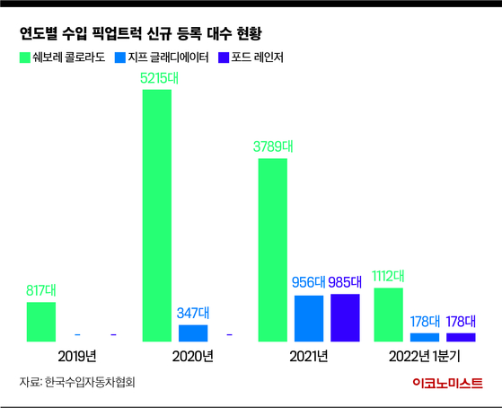 2019년 11월 출고가 시작된 쉐보레 콜로라도는 두 달간 817대의 신규 등록 대수를 기록했다. 이듬해(2020년)에는 5215대의 신규 등록 대수를 기록하며 수입차 시장에 안착했다. 수입 픽업트럭 시장의 가능성을 본 포드와 지프는 뒤늦게 자사 픽업트럭을 출시하며 도전장을 내밀었다. 2020년 FCA코리아(현 스텔란티스코리아)가 글래디에이터를, 2021년에는 포드세일즈서비스코리아가 레인저(와일드트랙, 랩터)를 선보였다.