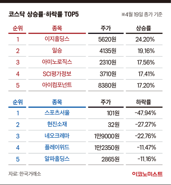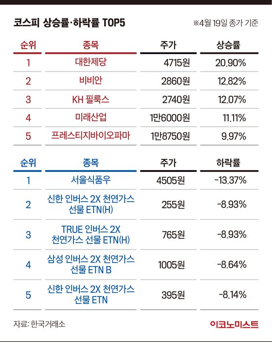코스피 상승률 1위 대한제당·코스닥 상승률 1위 이지홀딩스