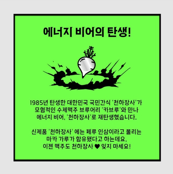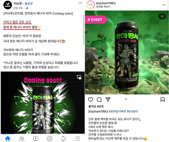 수제맥주기업 카브루가 진주햄의 대표 브랜드 ‘천하장사’와의 협업을 통해 출시한 ‘에너지 비어’가 국민건강증진법을 위반한 것으로 드러났다. 주류광고에 ‘에너지’라는 표현을 넣고, 스테미너 증강과 피로 회복 효과가 있다고 오인할 수 있는 홍보 활동을 펼쳤다는 것이다.