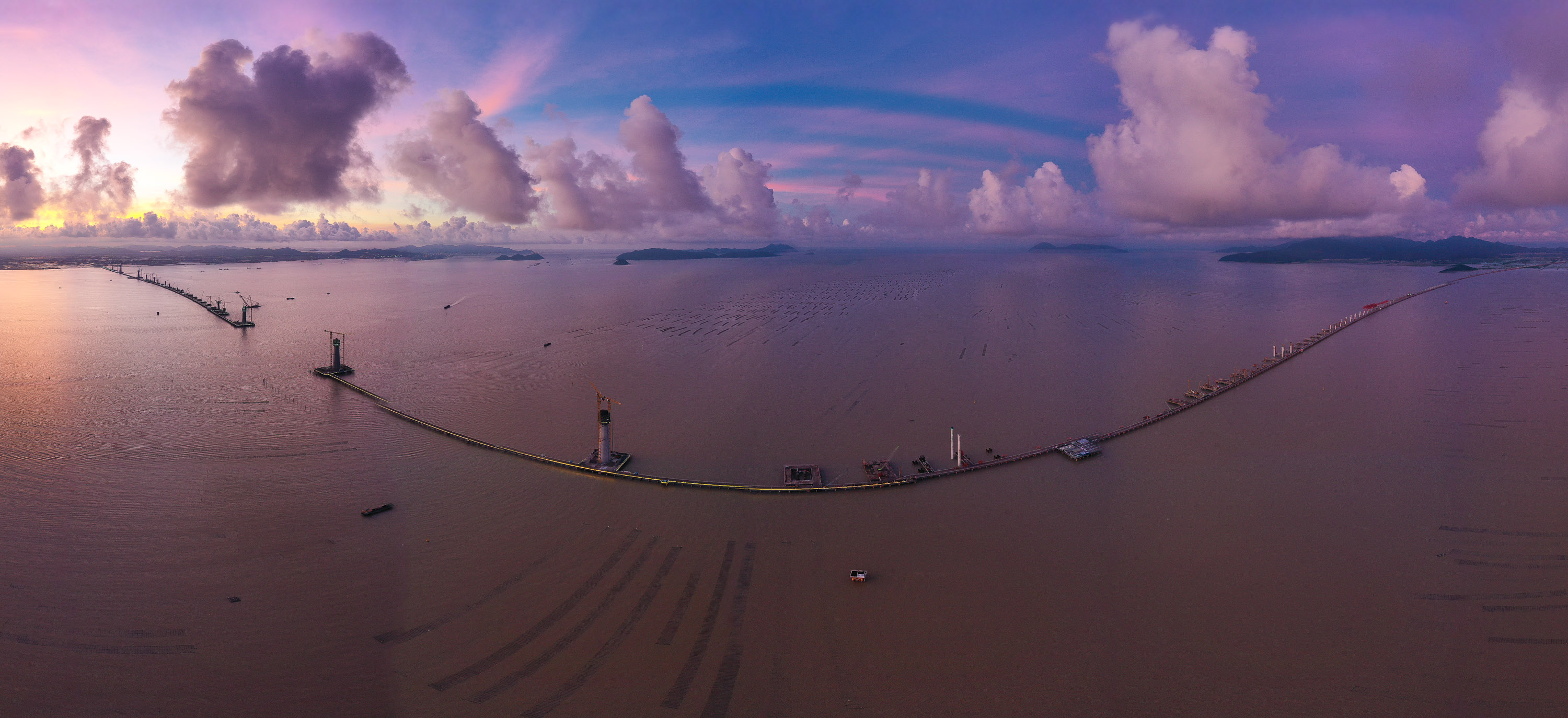 (중국 주하이=신화통신) 최근 황마오하이(黃茅海)대교의 주탑 시공이 한창 이뤄지고 있다. 황마오하이대교는 황마오하이 해상통로 프로젝트의 중요 일환으로 전체 길이가 2천200m에 달한다. 황마오하이 해상통로 프로젝트가 완공되면 강주아오(港珠澳)대교와 난사(南沙)대교 등과 연결돼 웨강아오 대만구(粵港澳大灣區·광둥-홍콩-마카오 경제권) 교통권이 형성될 것으로 기대된다. 28일 황마오하이 해상통로 프로젝트 시공 현장 드론 파노라마 사진. 2022.6.28
