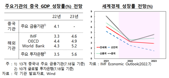 중국 GDP 성장률은 지난해 4분기에 전년 동기 대비 4.0%를 기록했고 올해 1분기에는 4.8%까지 높아졌지만, 2분기에 0.4%로 떨어졌다. 수출 성장률은 올해 1~6월에 14.2%로 전년 동기에 기록한 38.5%와 비교해 큰 폭으로 감소했다. 선전・상하이 봉쇄에 따른 조업중단과 항만・물류차질 등이 영향을 줬다.