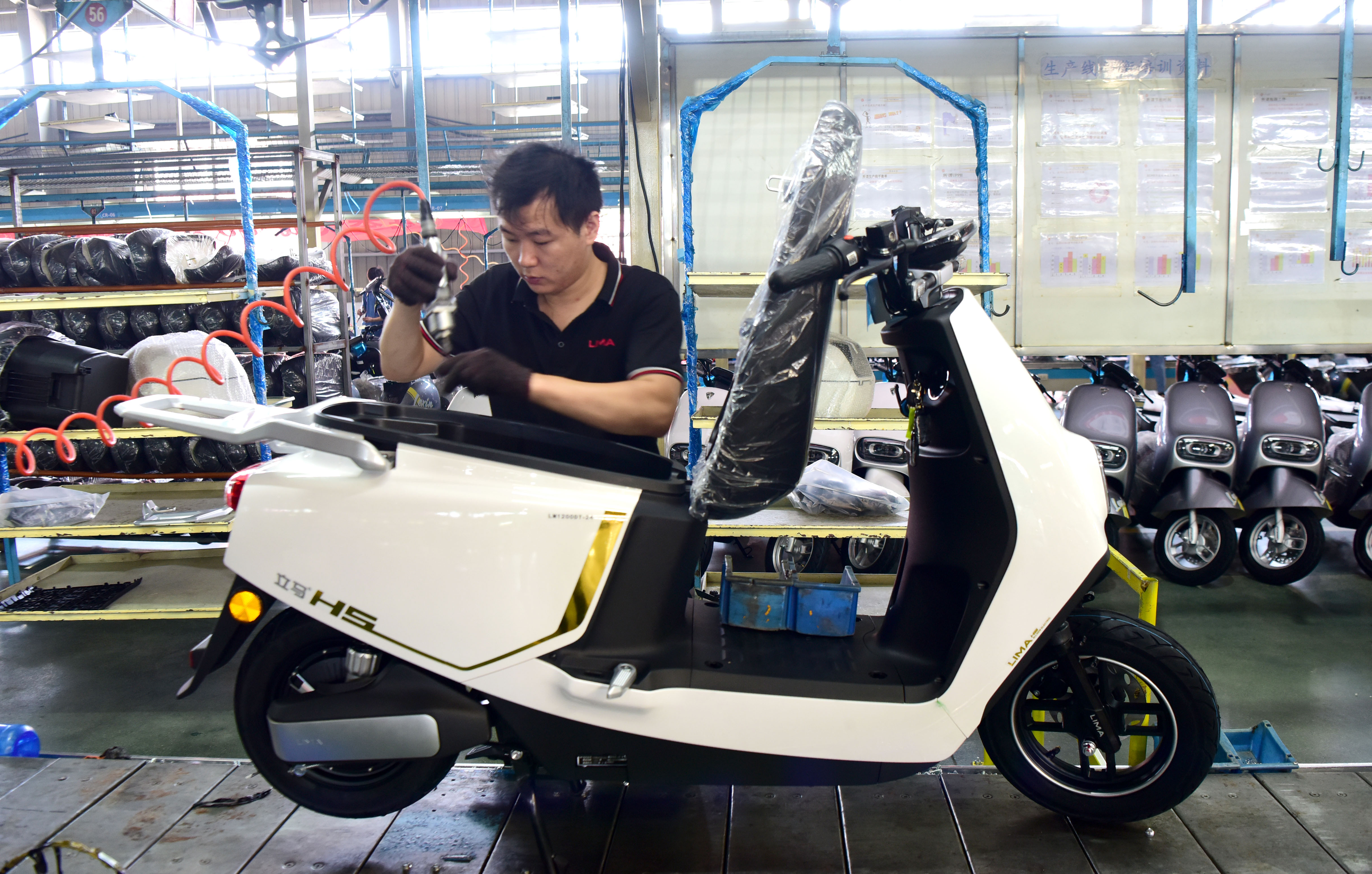 (중국 정저우=신화통신) 한 직원이 11일 허난(河南)성 주마뎬(駐馬店)시 루난(汝南)현 리마(立馬) 신에너지 전기오토바이 산업단지의 생산라인에서 제품을 조립하고 있다. 최근 수년간 이 지역은 신에너지 전기오토바이 산업 발전에 총력을 기울여 ▷생산 ▷연구개발 혁신 ▷판매 등을 모두 아우르는 산업 클러스터를 조성했다. 2022.8.11