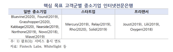 우리금융경영연구소에 따르면 미국에서는 2018년부터 중소기업 대상 뱅킹 서비스를 제공하는 인터넷전문은행이 확산됐다. 2022년 초 기준 미국 내 기업특화 인터넷은행은 최소 15곳 이상이다.