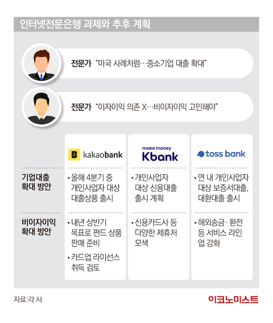 서지용 상명대 경영학부 교수는 “국내 인터넷전문은행은 예대마진 위주로 영업을 하고 있는데, 선진국의 사례를 보면 대체적으로 비이자 수익 창출 비중이 높다”면서 “다양한 금융상품과 신탁 상품, 외화송금, 투자 상품 등을 출시해 이자수익에 의존하는 수익 구조를 변화시켜야 한다”고 조언했다.